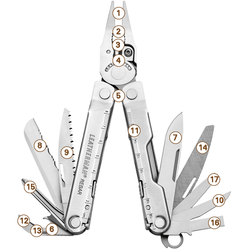 De Leatherman Rebar is een robuuste multitool met een tijdloos ontwerp, volledig vervaardigd uit roestvrij staal. Dit geeft de tool een stijlvolle en duurzame uitstraling. Met 17 praktische functies is de Rebar een ideale partner voor dagelijks gebruik, allerlei klussen en outdoor-avonturen. In het bijpassende groene nylon foudraal draag je deze sterke en compacte multitool veilig en gemakkelijk met je mee. Een betrouwbare keuze voor iedere gereedschapsliefhebber.